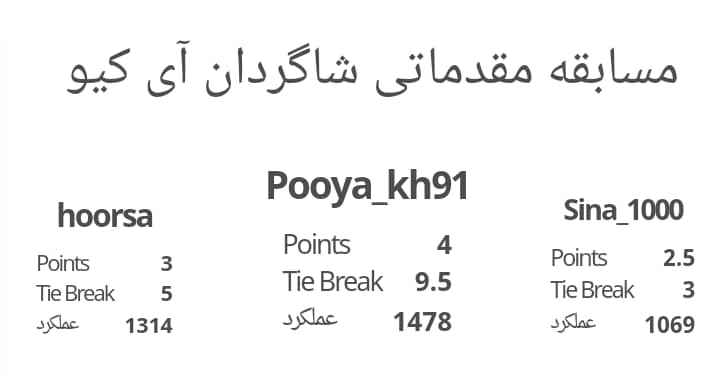 نتایج مسابقه شطرنج آی کیو بمناسبت عید غدیر با حضور 34 شرکت کننده در سه سطح مقدماتی و متوسطه و پیشرفته